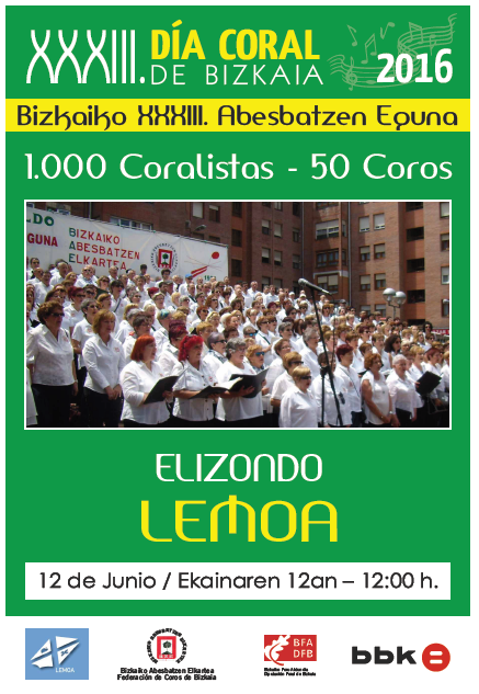 Izendatu gabeko egoitza Lemoa, Bizkaia, SpainUrtero egiten dugun legez, aurten Lemoan izango den Bizkaiko XXXIII Abesbatzen egunean parte hartuko dugu. ERREPERTORIOA: GOZIEKO IZARRA J. Santesteban BERRENKALE T. urrengoetxea BETI ESKAMAK KENTZEN A. Madina FESTARA R. Sarriegi DENOK ELKARREKIN EUSKAL HERRIKO (himno final de la Ópera Txanton Piperri) AGUR JAUNAK Kontzertua amaitzean BAZKARI HERRIKOIA izango dugu. (ZORNOTZAKO XXXII EDIZIOA)