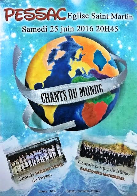 Saint Martin Elizan Place de la 5ème République, Pessac, FranceBertako Intermittence Abesbatzarekiko Kontzertua 2016ko ekainaren 25ean Pessaceko Sain Martín Elizan (Frantzia). Ordua: 20:45ean. Pessac. Eglise Saint Martin Pessaceko Kontzertuaren Errepertorioa: Garaizarko Matsorriak KYRIE H. Hammastrom SANCTA MARIA J. Schweitzer OTOIA M. Moreno AITA GUREA A. Madina ADOROTE DEVOTE R. Wagner PANGE LINGUA J.C. Calderón Choral Intermittence THULA BABA - (chant Africain ( berceuse ) SERENATA PARA LA […]