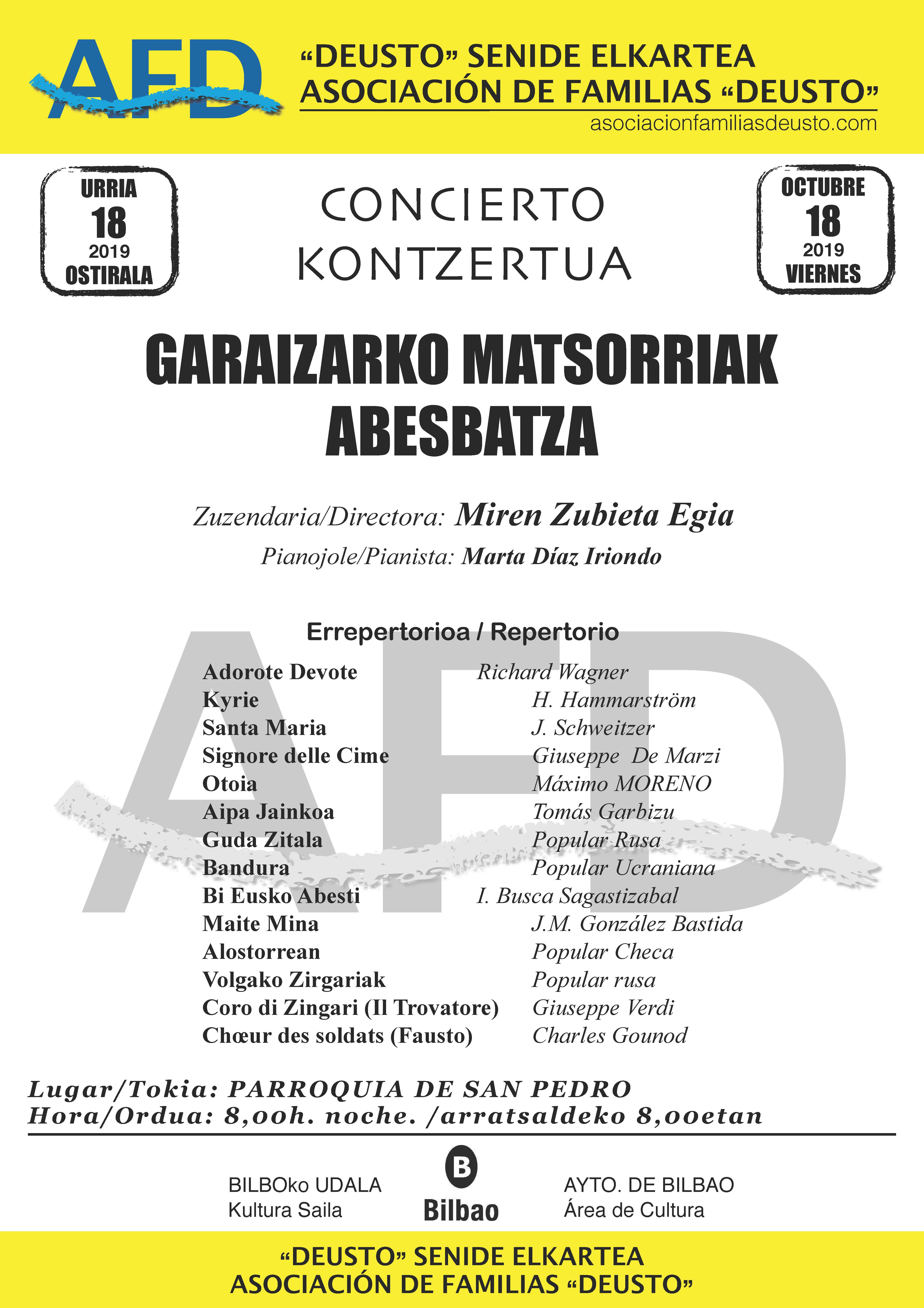 Atxuriko Enkarnazio Elizan Enkarnazio Plaza 9, BilbaoUrtero egin ohi dugun legez, Bilboko Udaleko dirulaguntzaz Gabonetako kontzertua eskainiko dugu. Aurton Enkarnazio elizan izango gaituzue arratsaldeko 19:30etan 2019ko abenduaren 27an, ostirala. Abesbatza parte-hartzaileak: Begoñako Sustraiak. Garaizarko Matsorriak.
