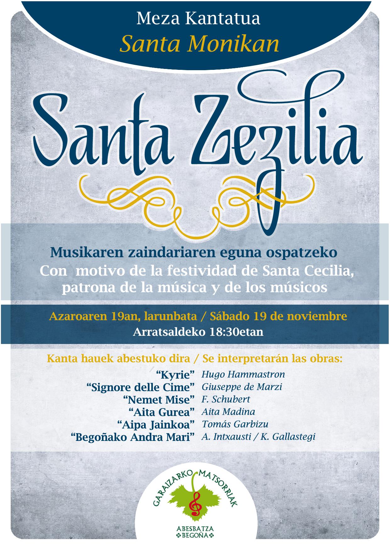 “Garaizarko Matsorriak” celebrará la festividad de Santa Cecilia el sábado 19 de noviembre, a las 6:30 de la tarde, en el monasterio de Santa Mónica de Begoña, con la tradicional misa cantada en memoria de los coralistas y allegados fallecidos durante el año.