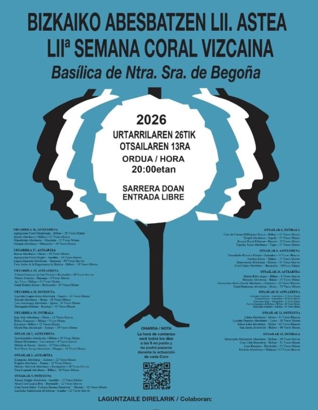 Basílica de Ntra. Sra. de Begoña (Bilbao) Virgen de Begoña 38, Bilbao, Bizkaia, EspañaCORALES PARTICIPANTES Garaizarko Matsorriak Abesbatza (Begoña) - Voces graves. Coro Club Deportivo (Bilbao) - Voces mixtas. Coro Kantarte (Barakaldo) - Voces mixtas. Kirikiño Abesbatza (Mañaria) - Voces blancas. PROGRAMA COMPLETO 👈